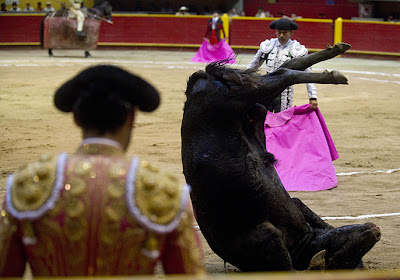 | Medellin, Colombia: A bull makes a turn on its horns during a bullfight at La Macarena bullring |